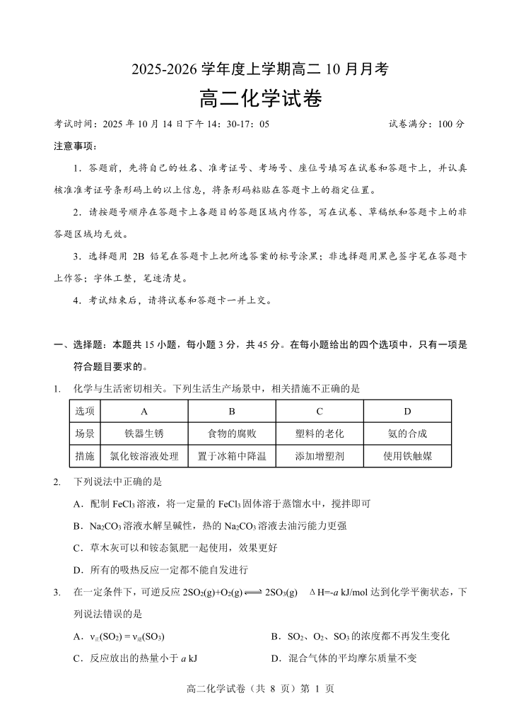 楚天协作体2025-2026学年度上学期高二10月月考 化学.pdf