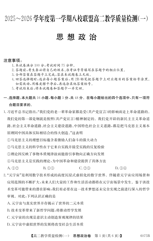 广东省2025~2026学年度第一学期八校联盟高二教学质量检测(一)政治.pdf
