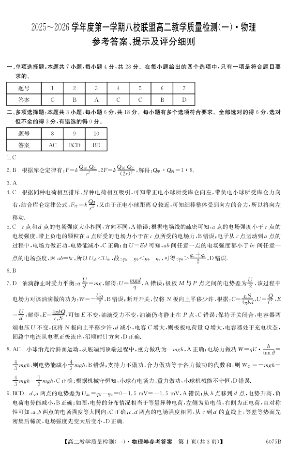 广东省2025~2026学年度第一学期八校联盟高二教学质量检测(一)物理答案.pdf