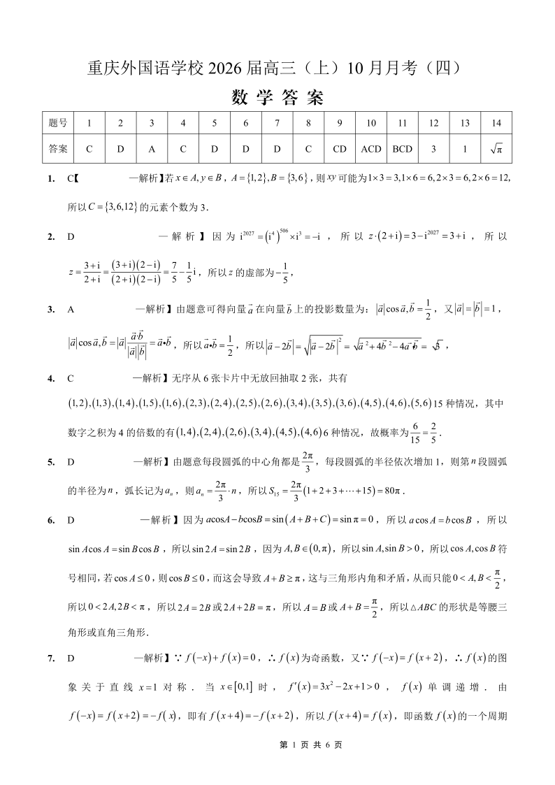 重庆外国语学校2026届高三(上)10月月考(四)数学答案.pdf