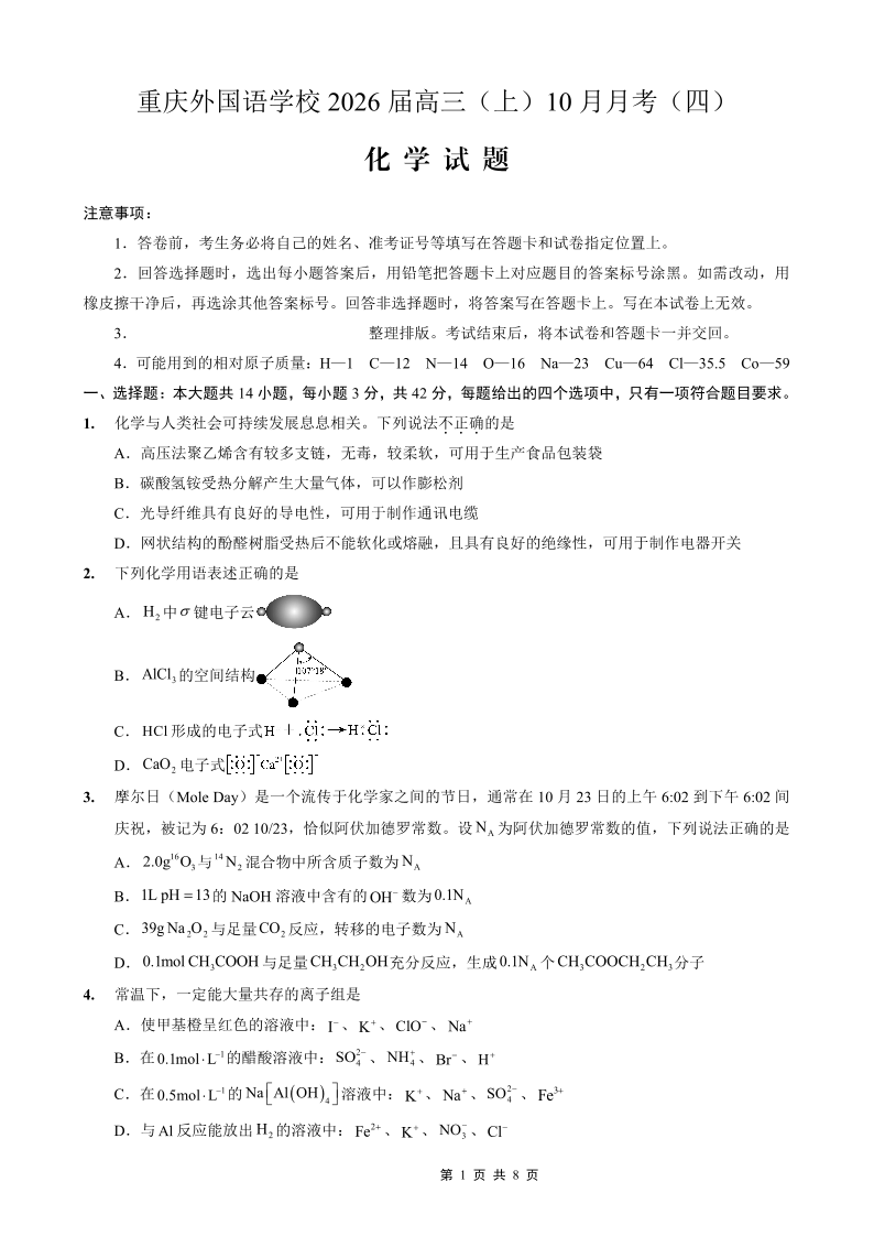 重庆外国语学校2026届高三(上)10月月考(四)化学.pdf