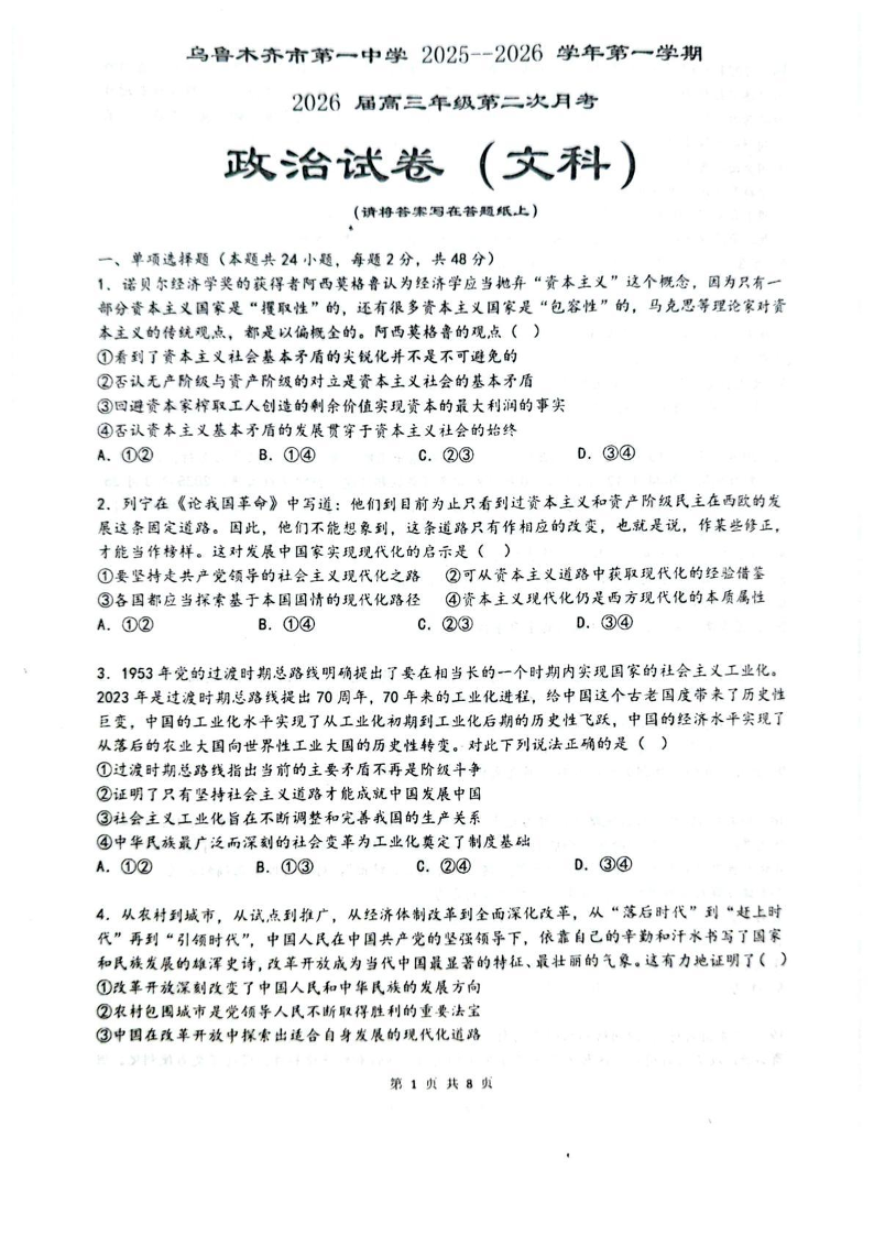 乌鲁木齐市第一中学2025--2026学年第一学期高三年级第二次月考 政治.pdf