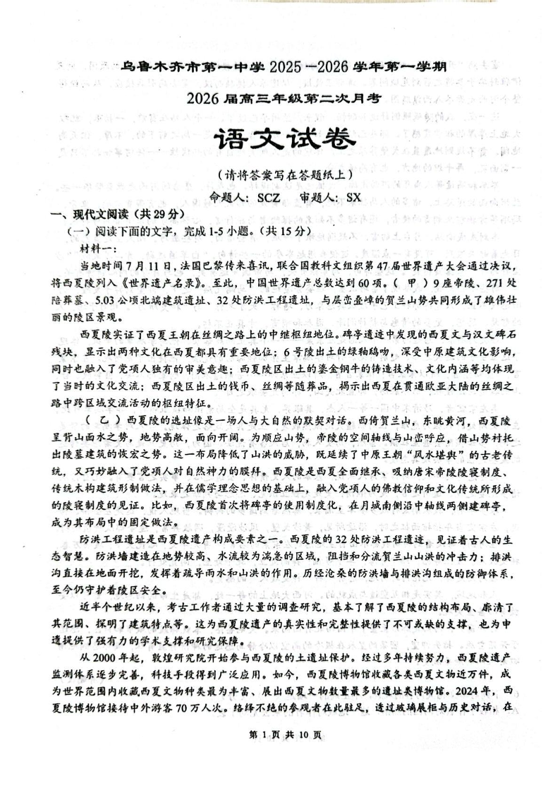 乌鲁木齐市第一中学2025--2026学年第一学期高三年级第二次月考 语文.pdf