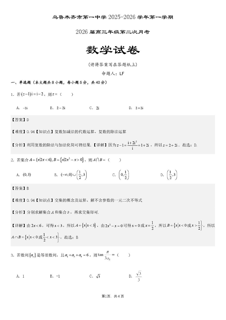乌鲁木齐市第一中学2025--2026学年第一学期高三年级第二次月考 数学答案.pdf
