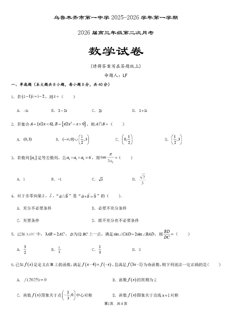 乌鲁木齐市第一中学2025--2026学年第一学期高三年级第二次月考 数学.pdf