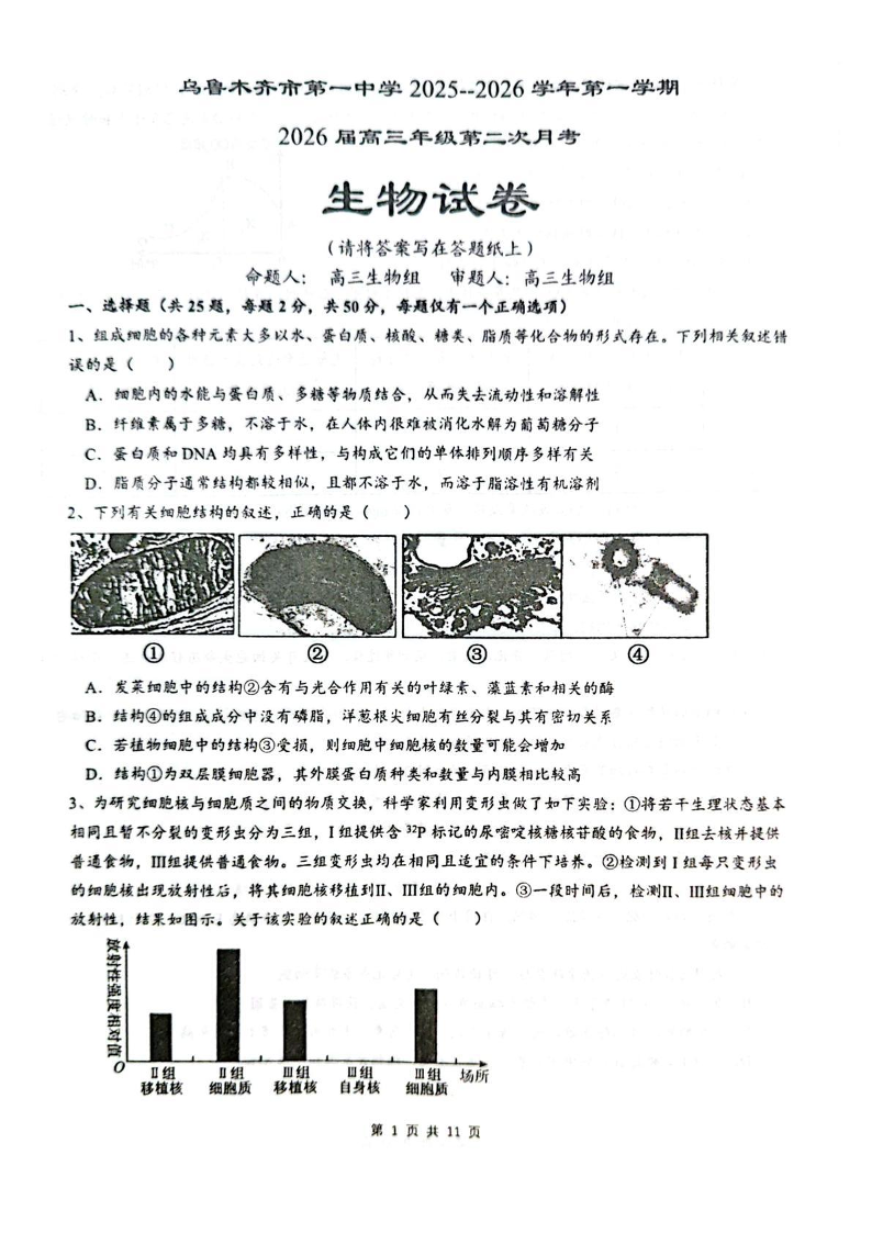 乌鲁木齐市第一中学2025--2026学年第一学期高三年级第二次月考 生物.pdf