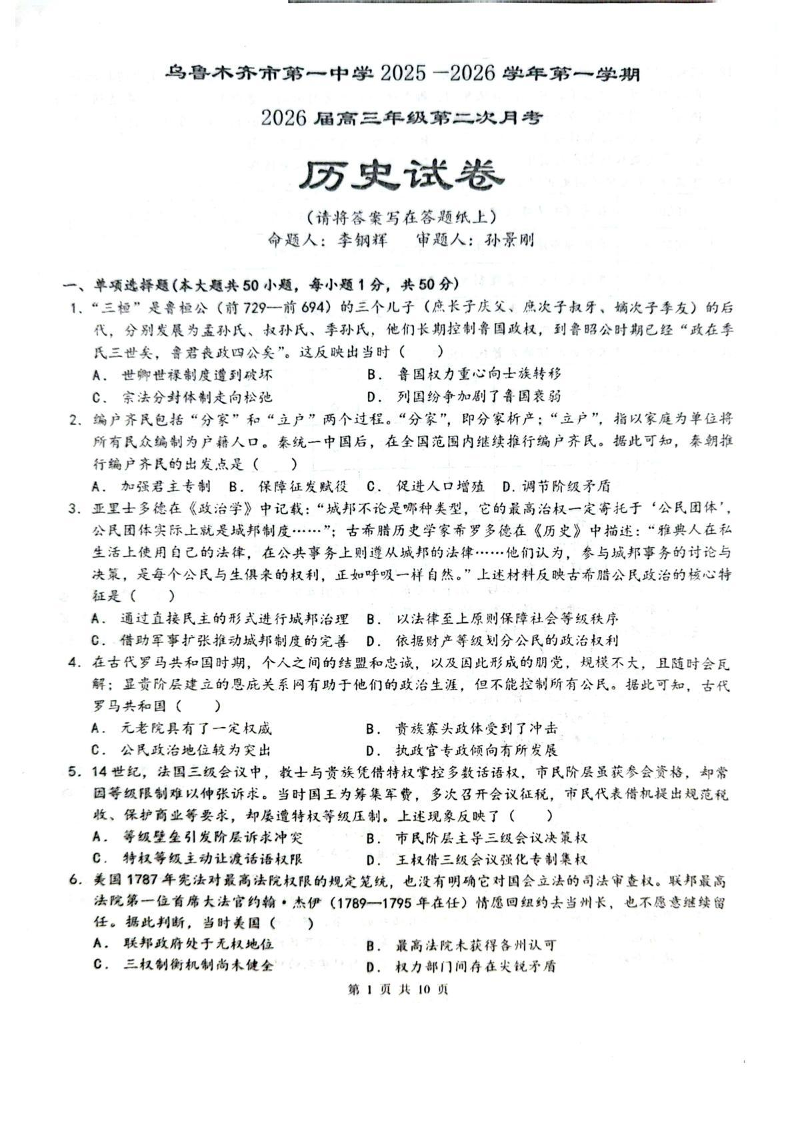 乌鲁木齐市第一中学2025--2026学年第一学期高三年级第二次月考 历史.pdf