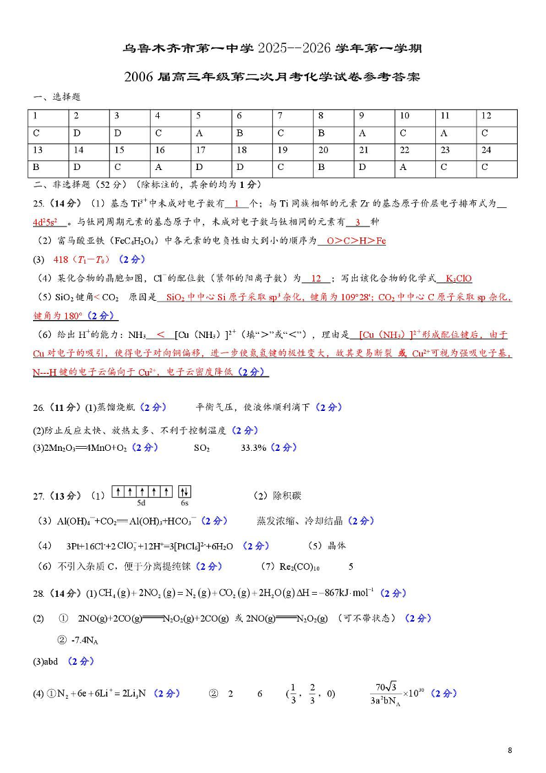 乌鲁木齐市第一中学2025--2026学年第一学期高三年级第二次月考 化学答案.pdf