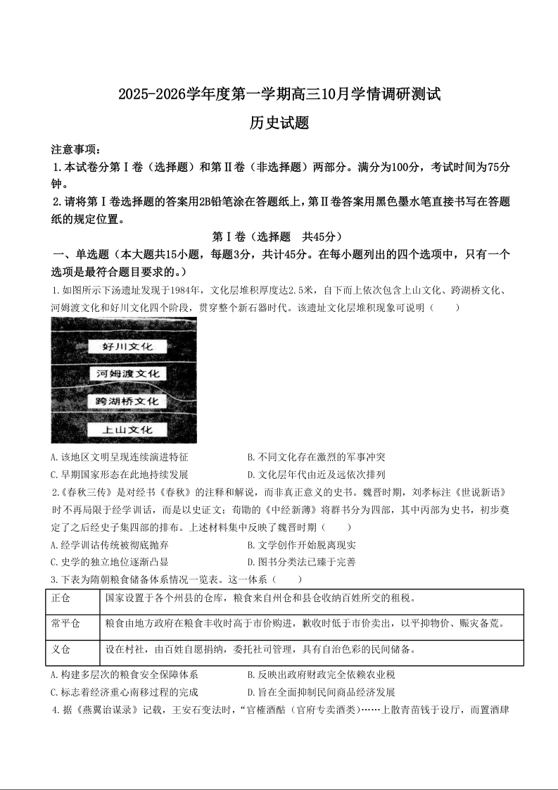江苏省扬州市高邮市2026届第一学期高三10月学情调研测试 历史试卷(含答案).docx