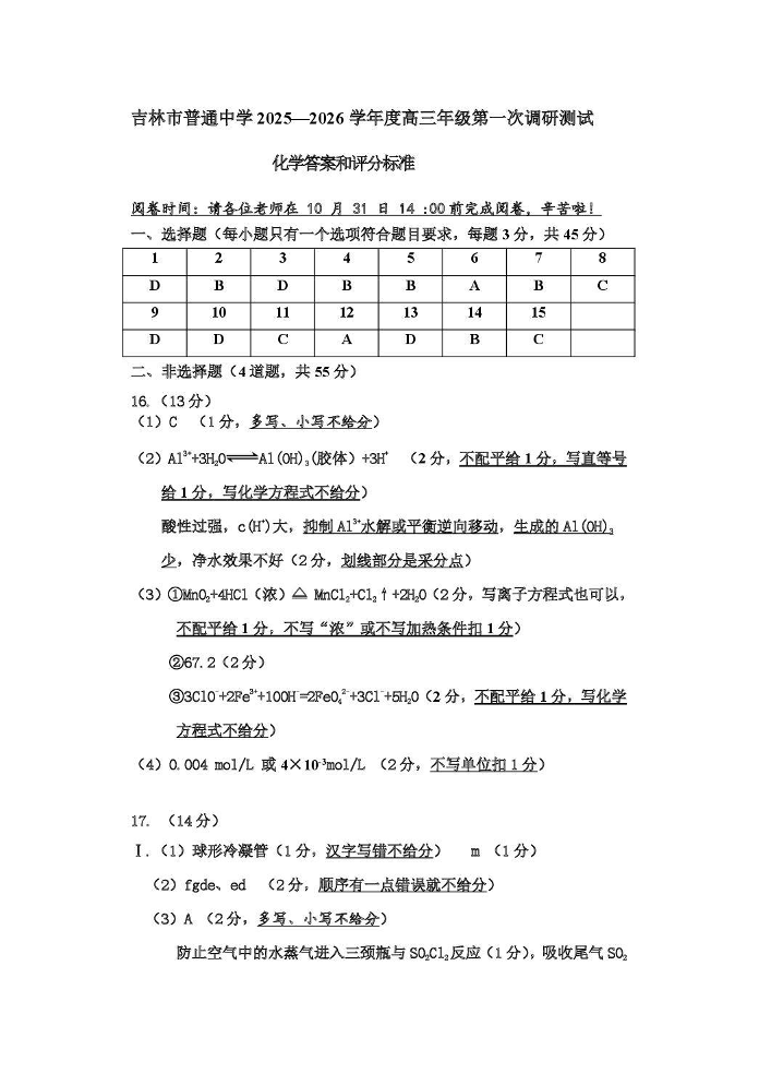 吉林地区普通中学2025-2026学年度高中毕业年级第一次调研测试 化学答案.pdf