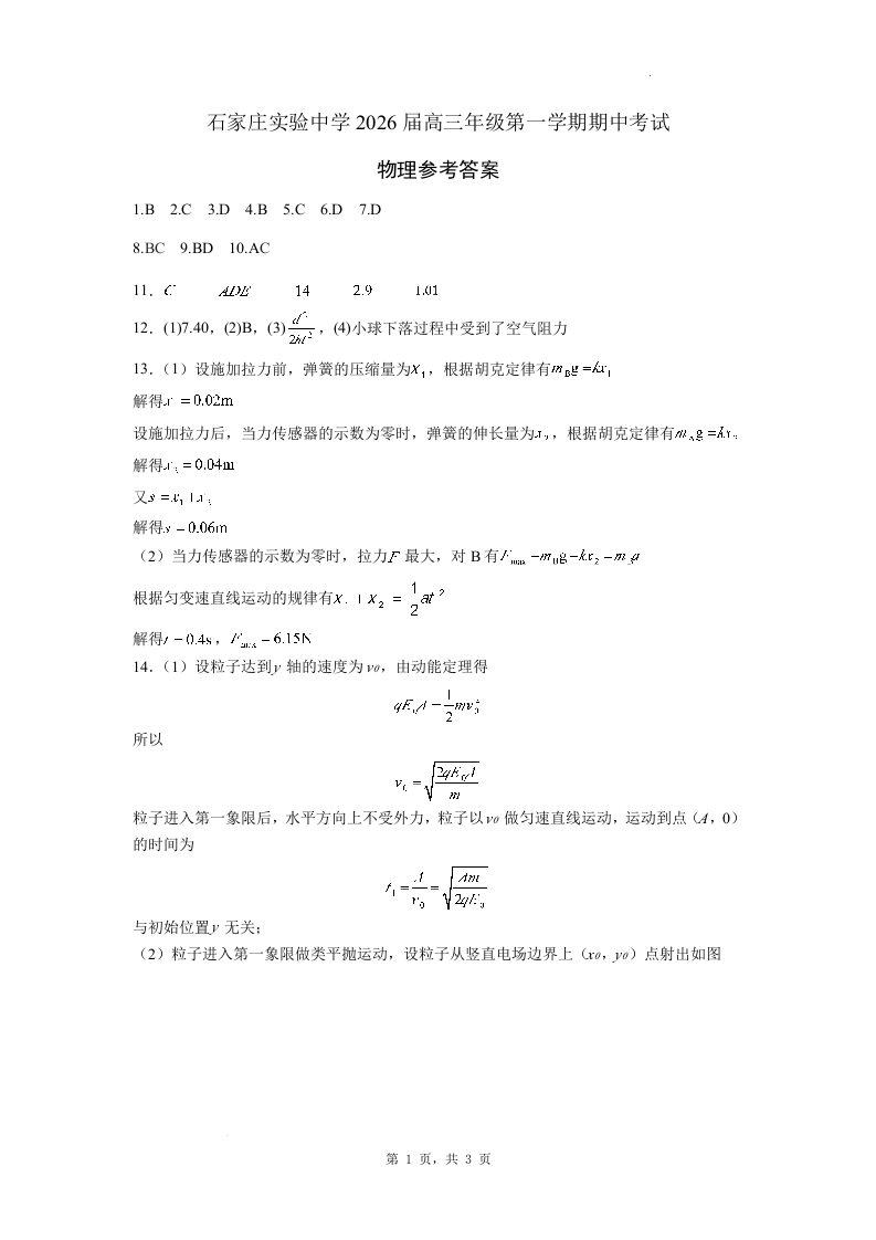 石家庄实验中学2026届高三年级第一学期期中考试 物理答案.docx