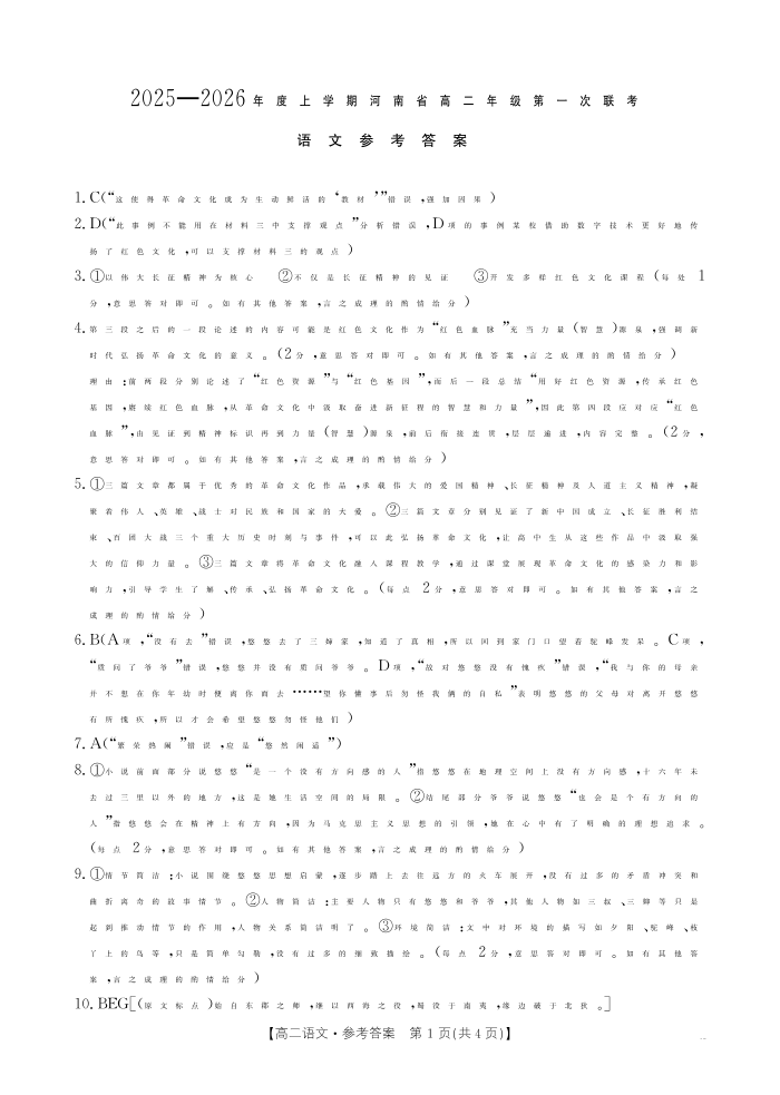 河南省2025-2026年度上学期高二年级第一次联考 语文答案.pdf