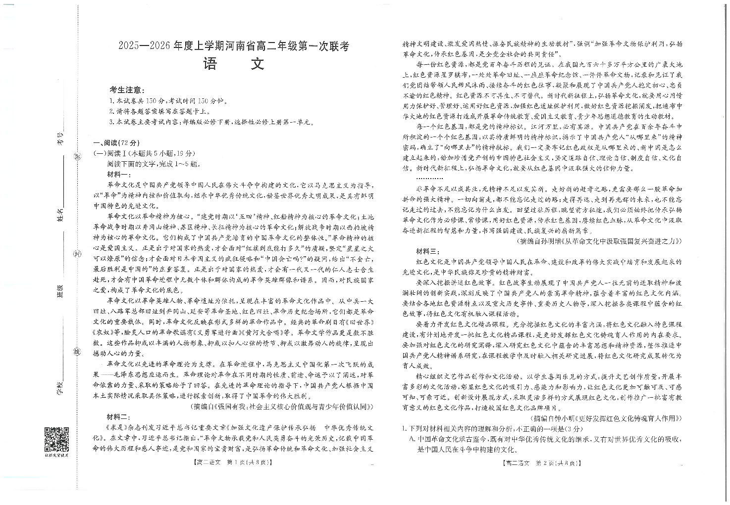 河南省2025-2026年度上学期高二年级第一次联考 语文.pdf
