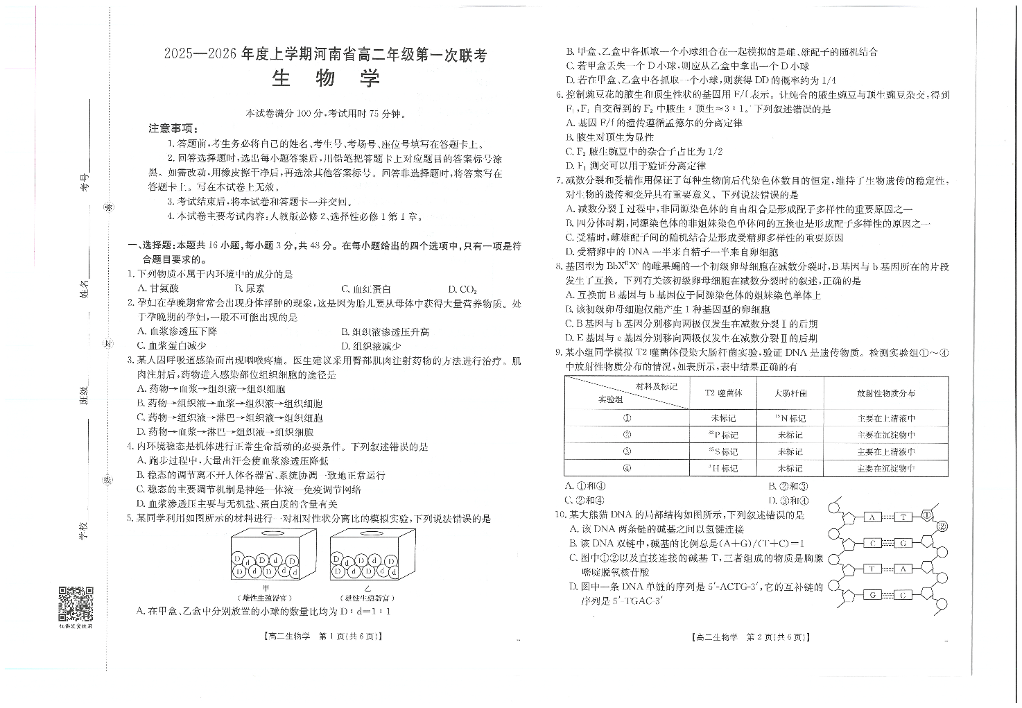河南省2025-2026年度上学期高二年级第一次联考 生物.pdf