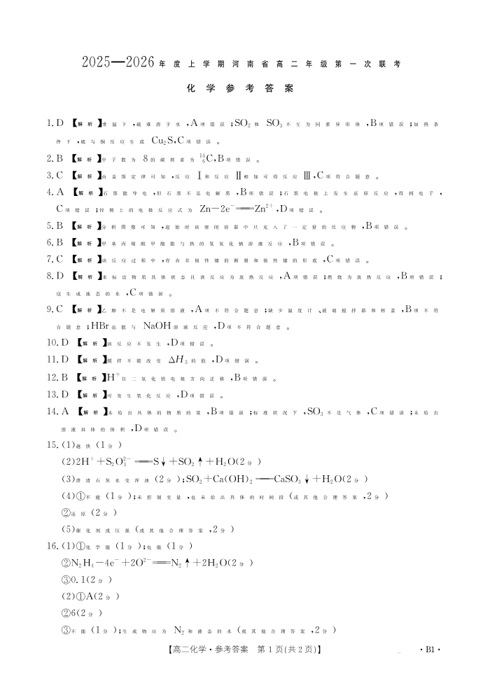 河南省2025-2026年度上学期高二年级第一次联考 化学B1答案.pdf