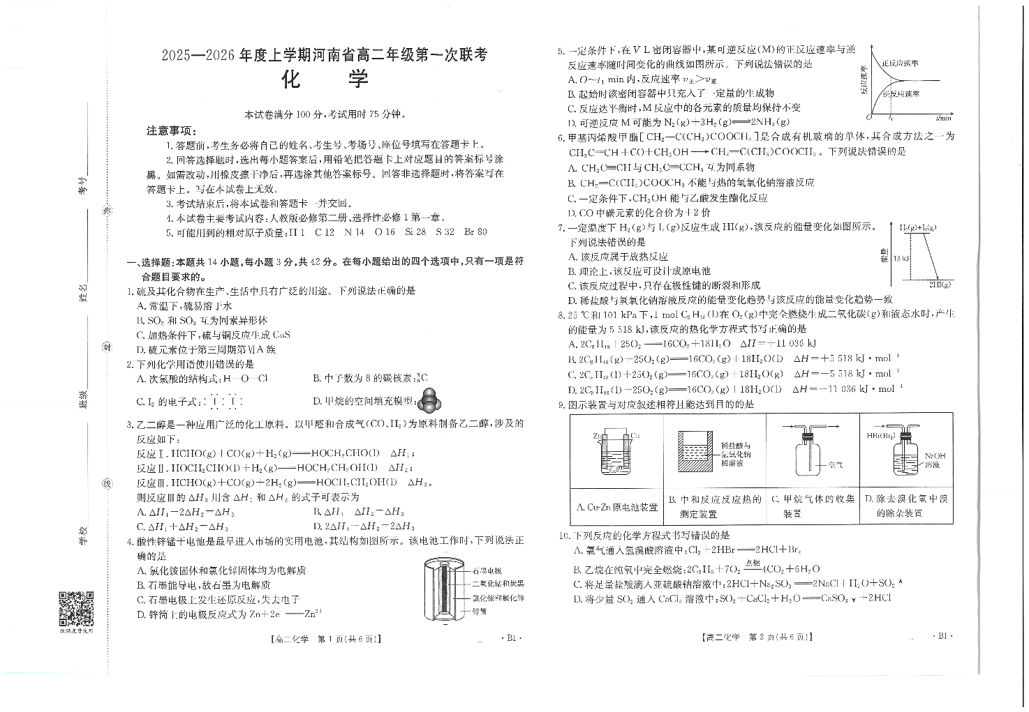 河南省2025-2026年度上学期高二年级第一次联考 化学.pdf