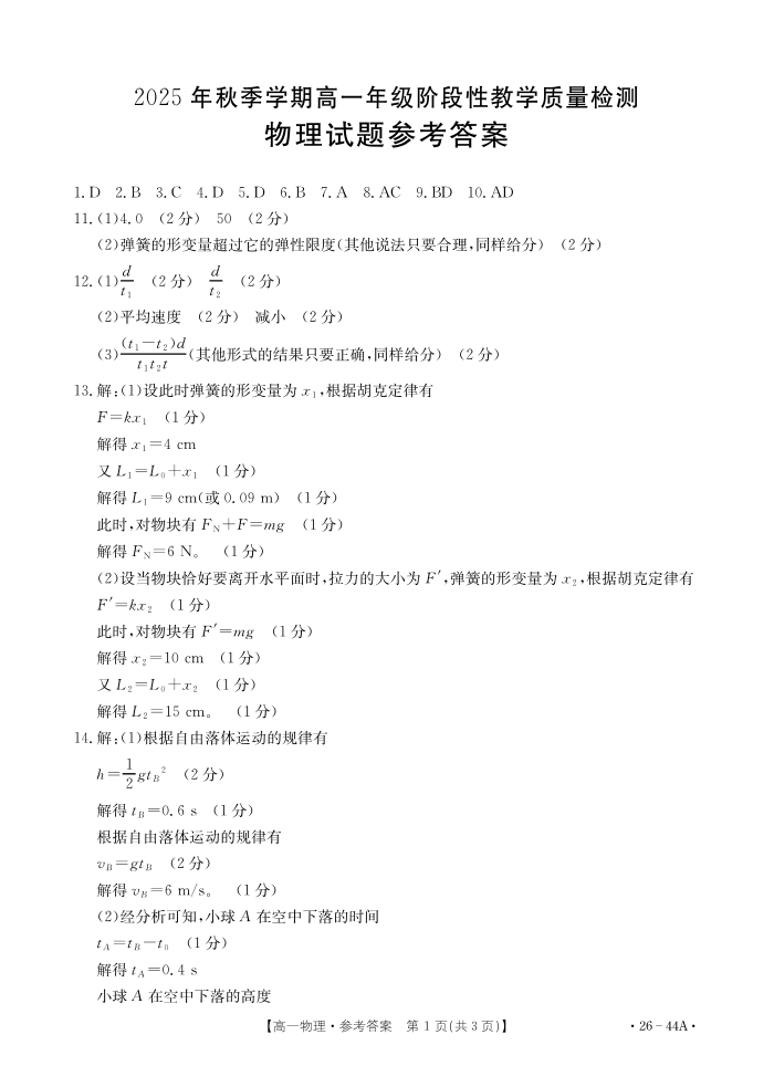 广西2025年秋季学期高一年级阶段性教学质量检测 物理(人教版)答案.pdf