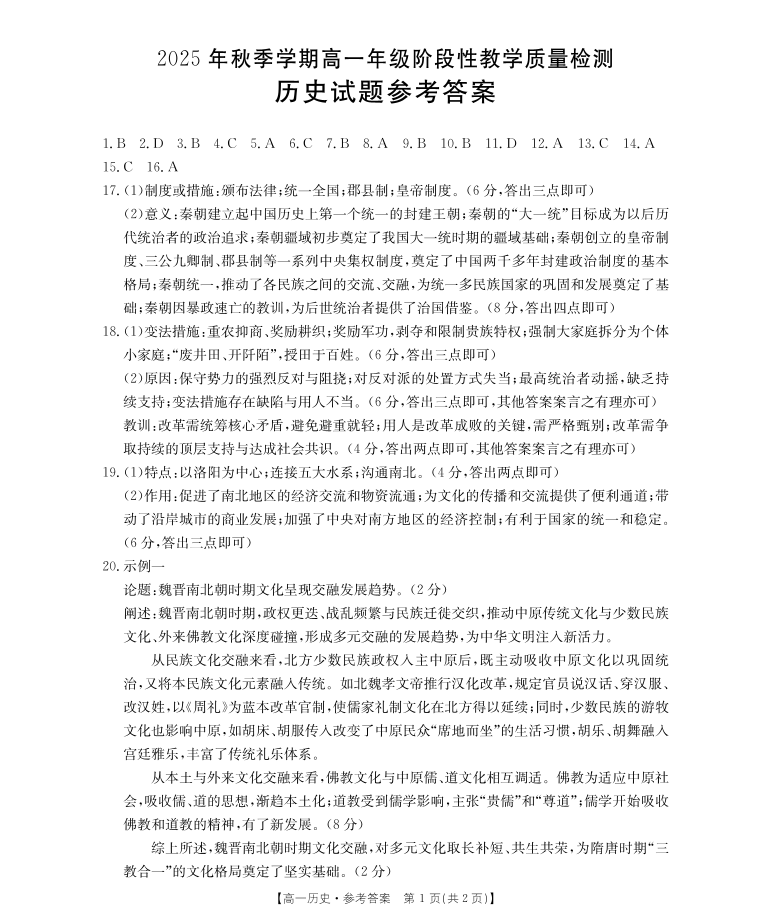 广西2025年秋季学期高一年级阶段性教学质量检测 历史答案.pdf