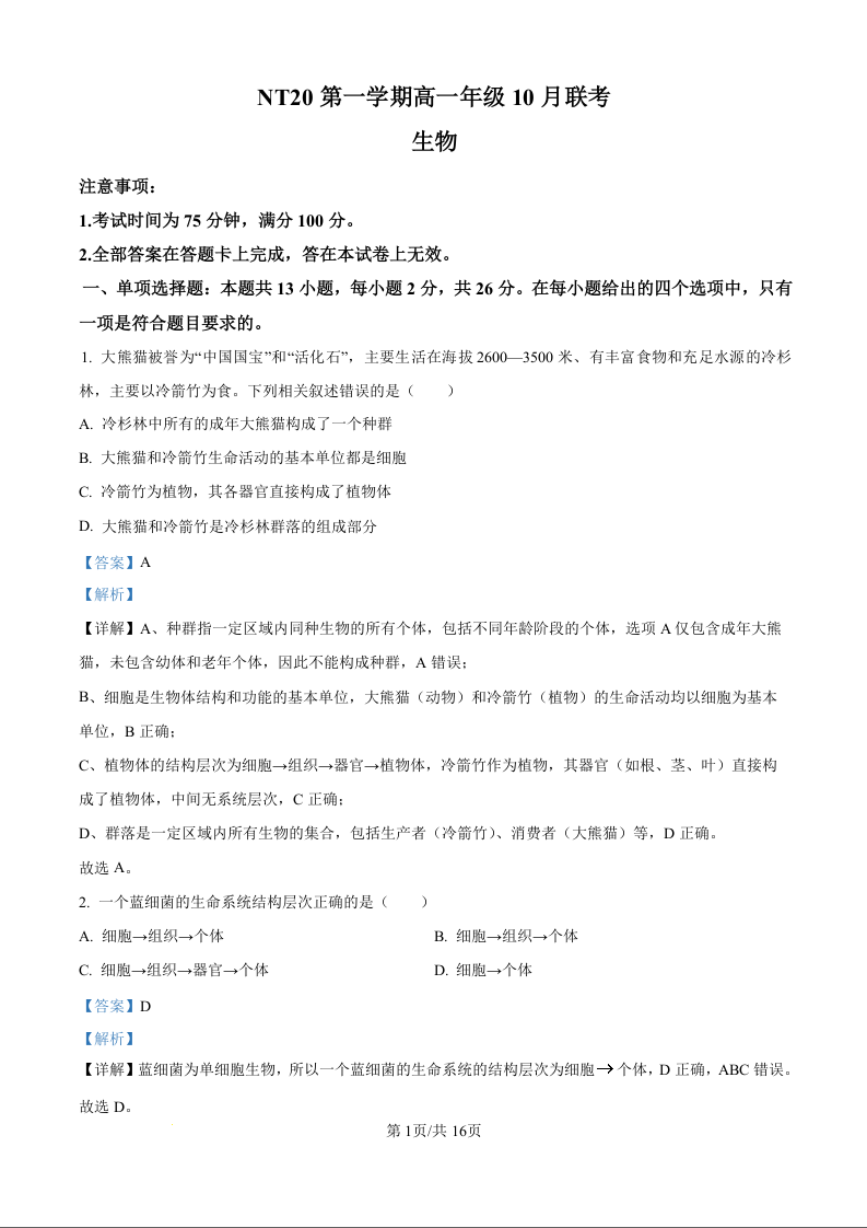 河北省NT20名校联合体2025-2026学年第一学期高一年级10月联考 生物答案.docx