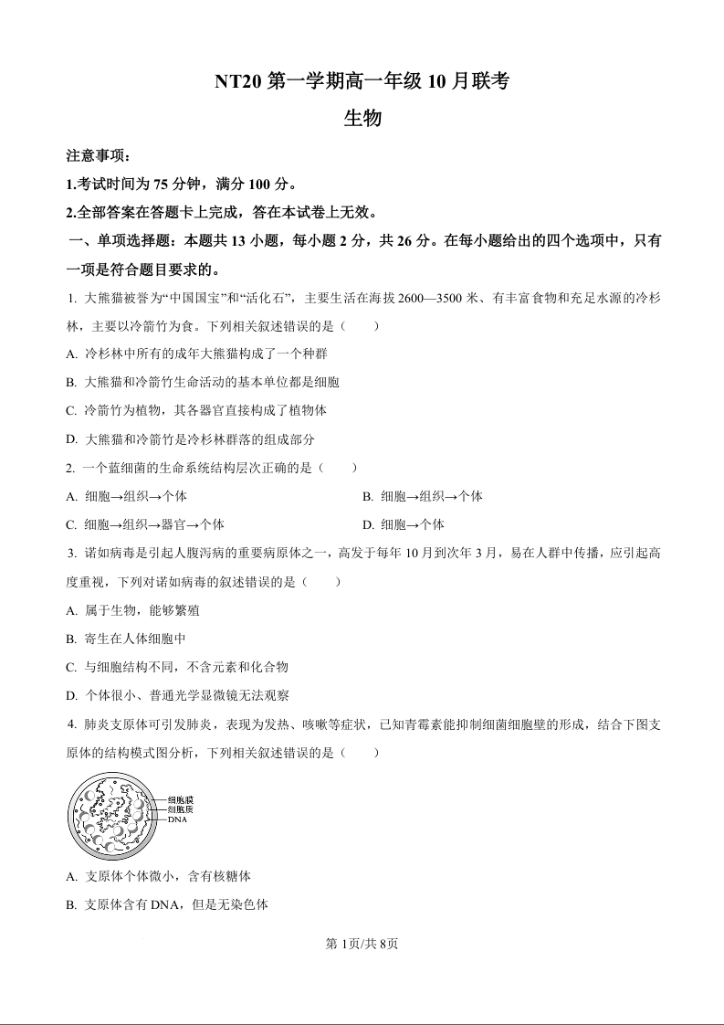 河北省NT20名校联合体2025-2026学年第一学期高一年级10月联考 生物.docx