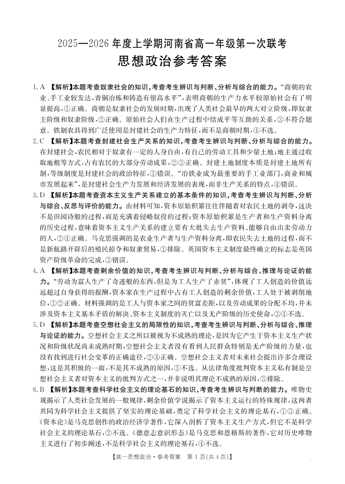 河南省2025-2026年度上学期高一年级第一次联考 政治答案.pdf