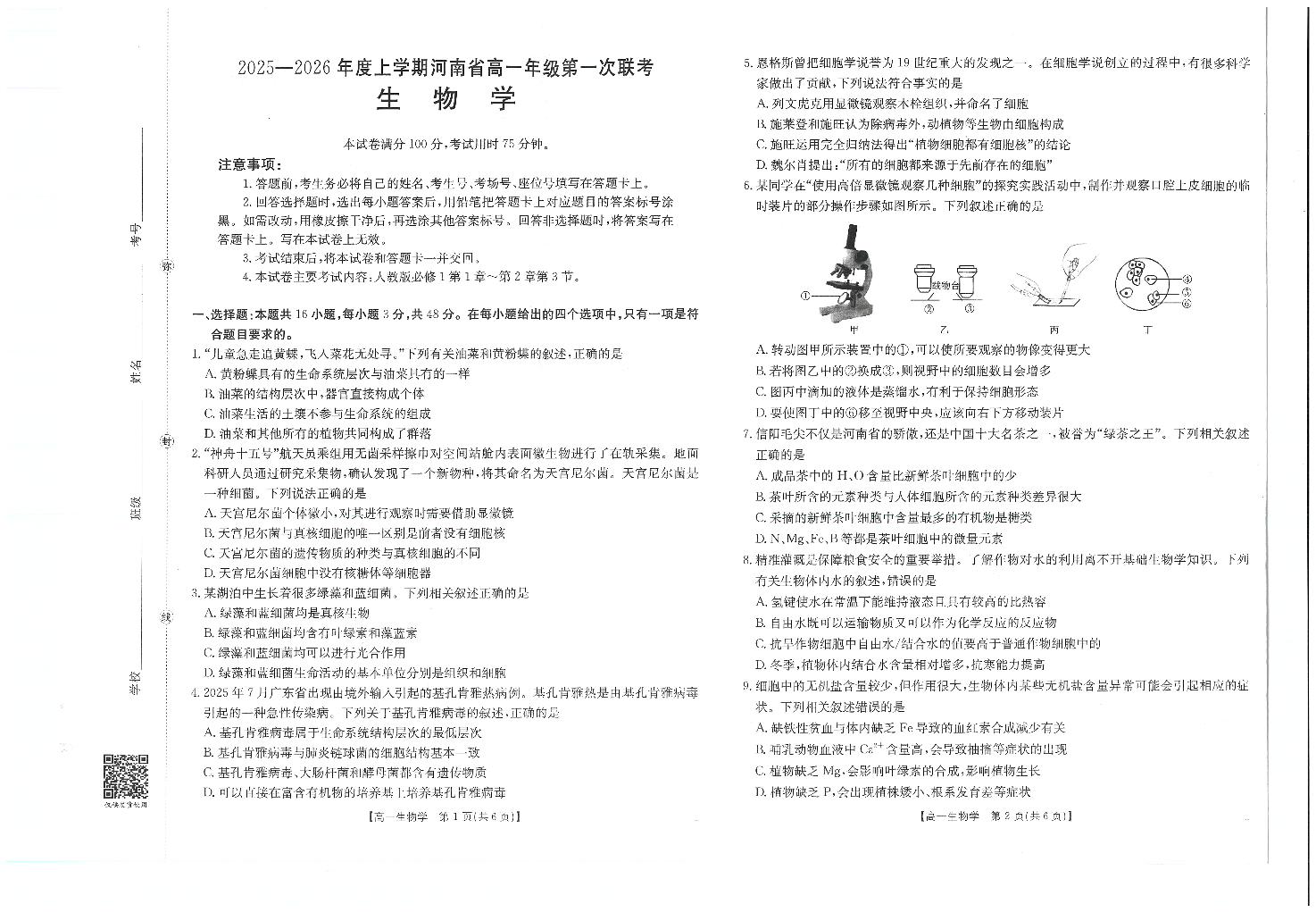 河南省2025-2026年度上学期高一年级第一次联考 生物.pdf