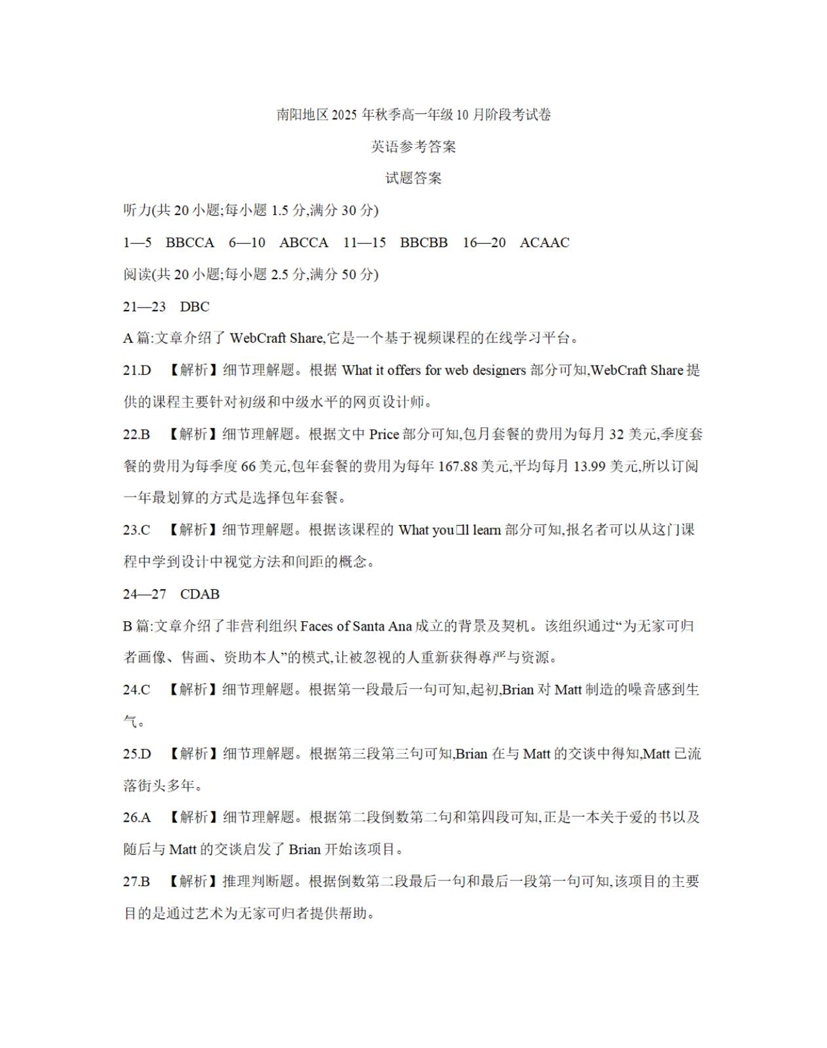 河南省南阳地区2025年秋季高一年级10月阶段考试卷 英语答案.pdf