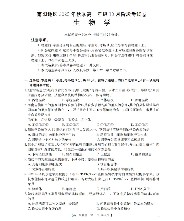 河南省南阳地区2025年秋季高一年级10月阶段考试卷 生物.pdf