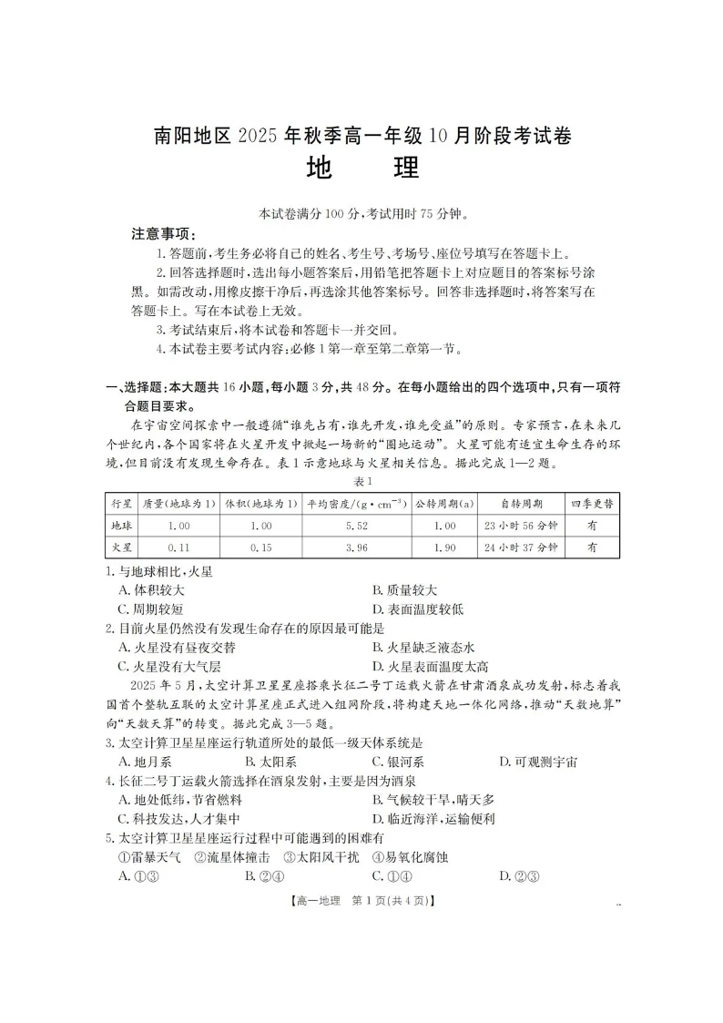 河南省南阳地区2025年秋季高一年级10月阶段考试卷 地理试题(含答案).pdf