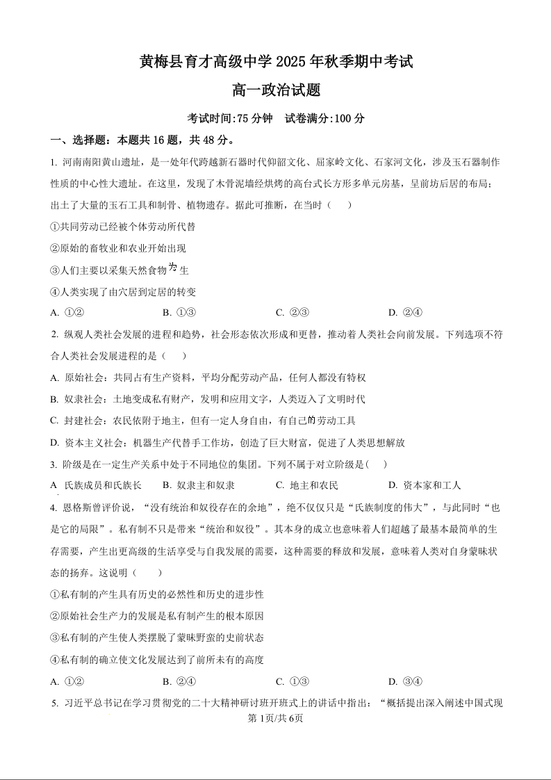 2025年秋季育才高级中学高一年级期中考试 政治.docx
