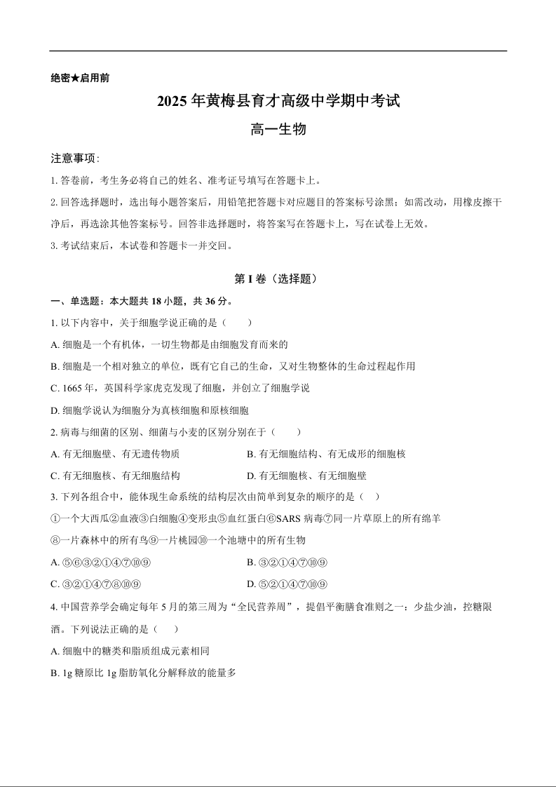 2025年秋季育才高级中学高一年级期中考试 生物.docx