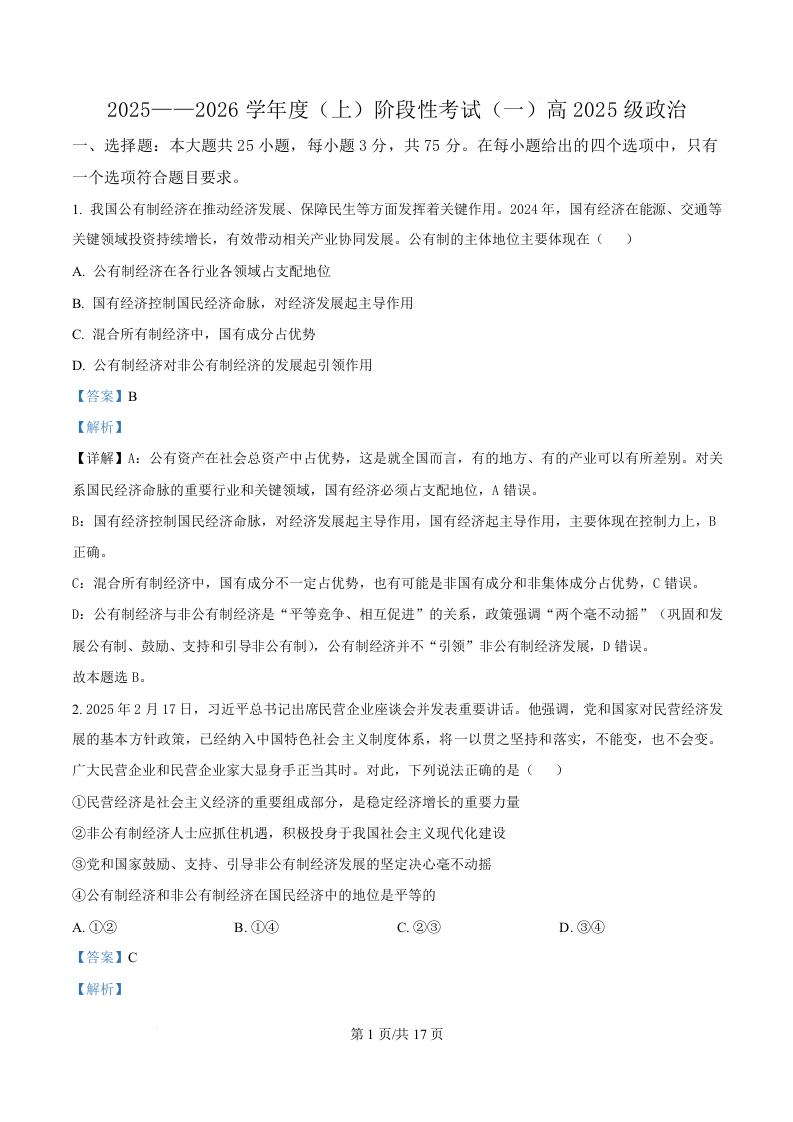 四川省成都市列五中学2025-2026学年高一上学期阶段性考试(一)政治答案.docx