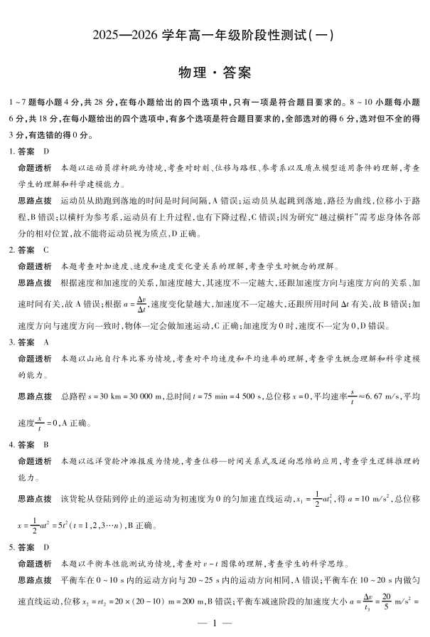 【物理答案】天一大联考·2025-2026学年高一年级阶段性测试(一).pdf
