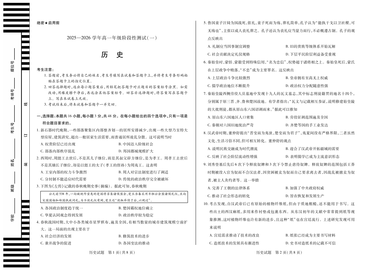 【历史】天一大联考·2025-2026学年高一年级阶段性测试(一).pdf