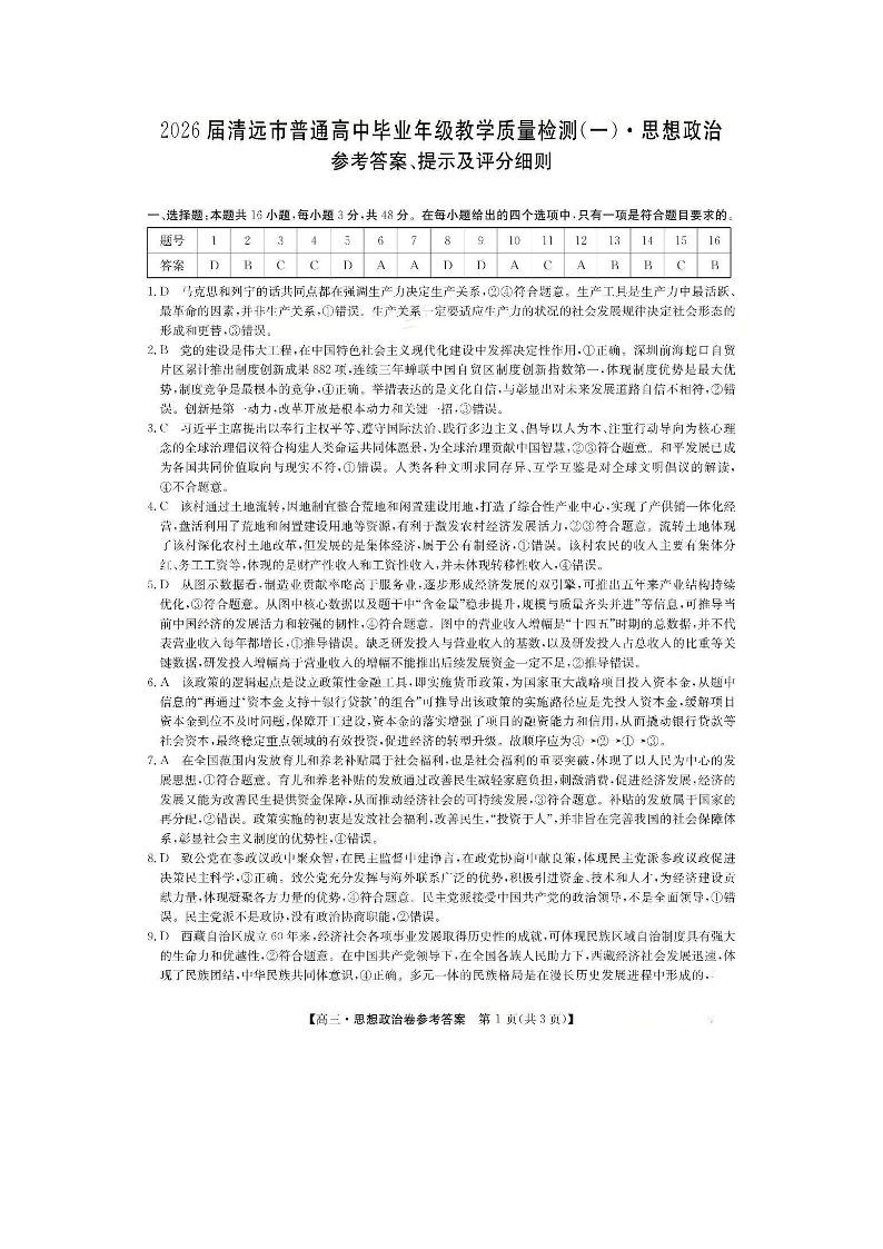 2026届清远市普通高中毕业年级教学质量检测(一)政治答案.pdf