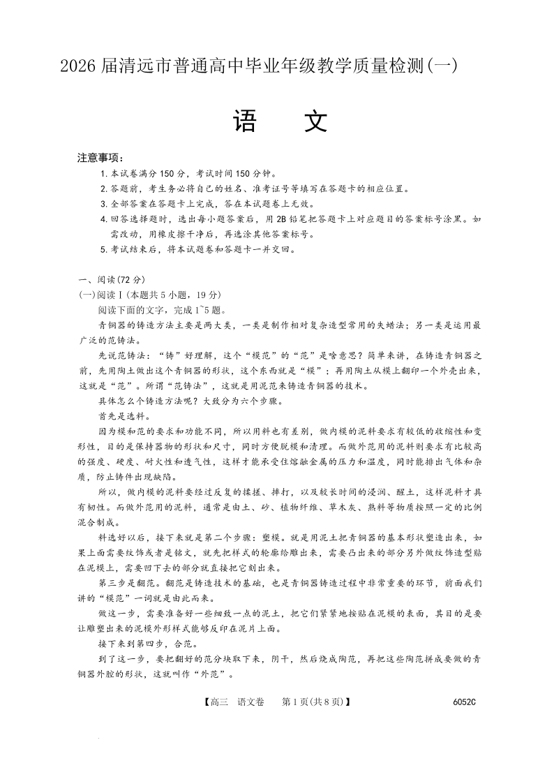 2026届清远市普通高中毕业年级教学质量检测(一)语文.pdf
