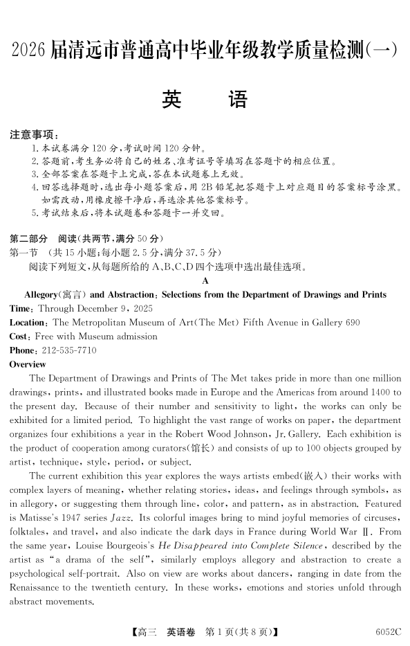 2026届清远市普通高中毕业年级教学质量检测(一)英语.pdf