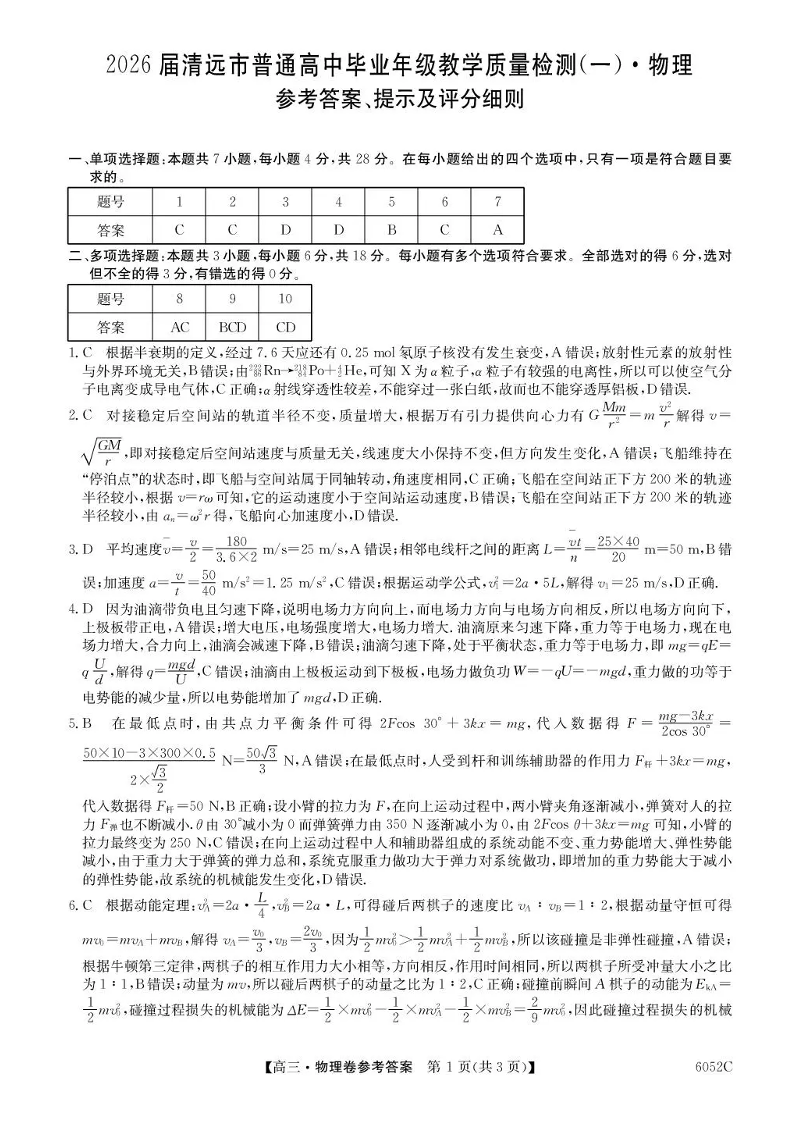 2026届清远市普通高中毕业年级教学质量检测(一)物理答案.pdf