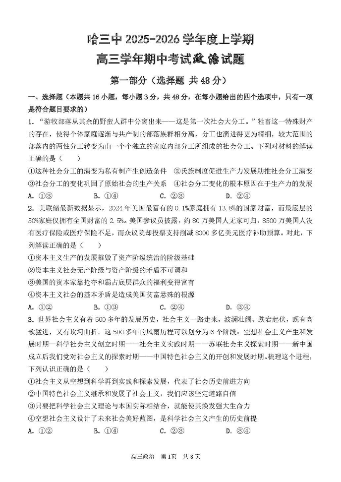 哈三中2025-2026学年度上学期高三学年期中考试 政治.pdf