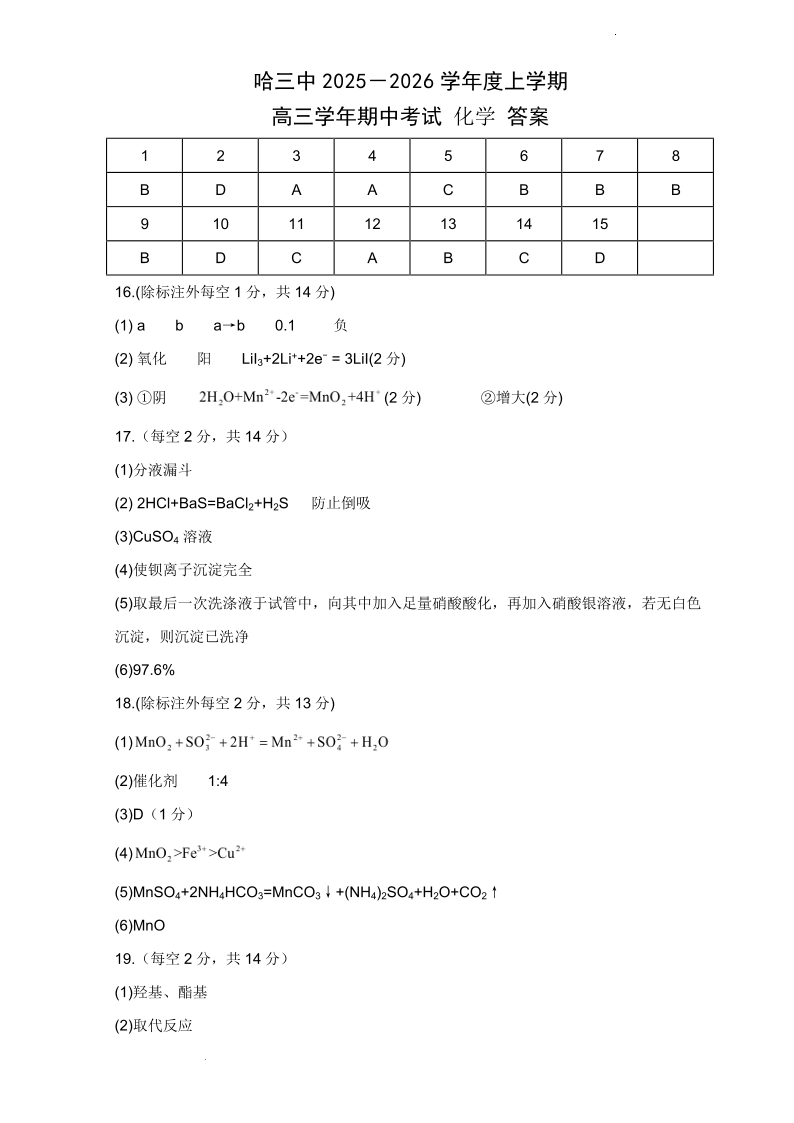 哈三中2025-2026学年度上学期高三学年期中考试 化学答案.pdf
