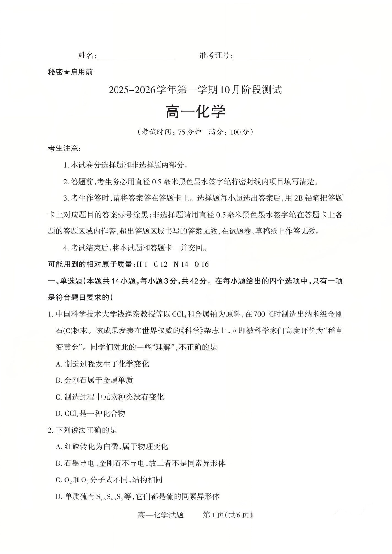 山西省2025-2026学年第一学期10月阶段测试 化学.pdf