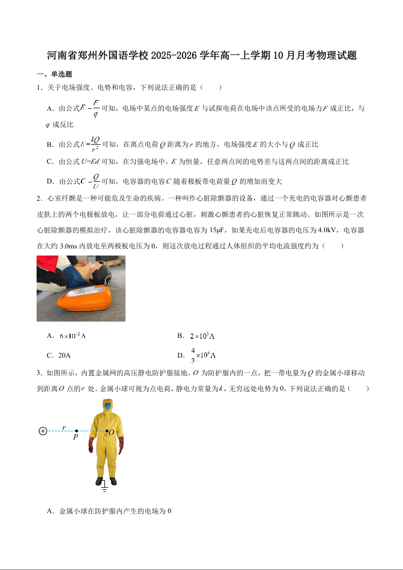 河南省郑州外国语学校2025-2026学年高一上学期10月月考 物理试题(含答案).docx