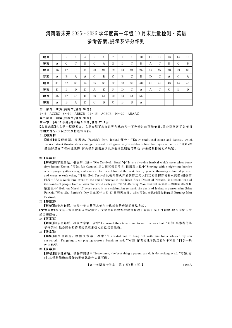河南省新未来大联考2025-2026学年高一上学期10月末质量检测 英语答案.docx