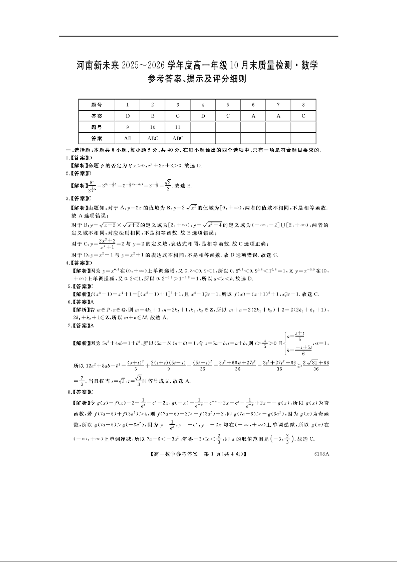河南省新未来大联考2025-2026学年高一上学期10月末质量检测 数学答案.docx