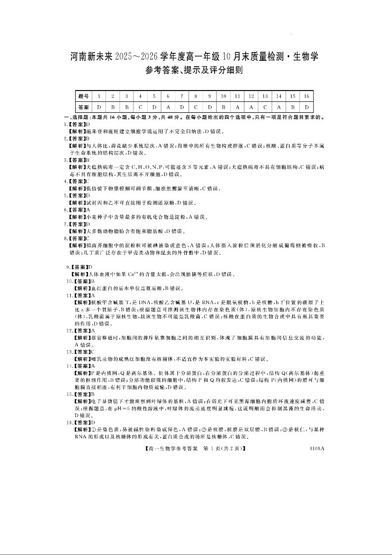 河南省新未来大联考2025-2026学年高一上学期10月末质量检测 生物答案.docx