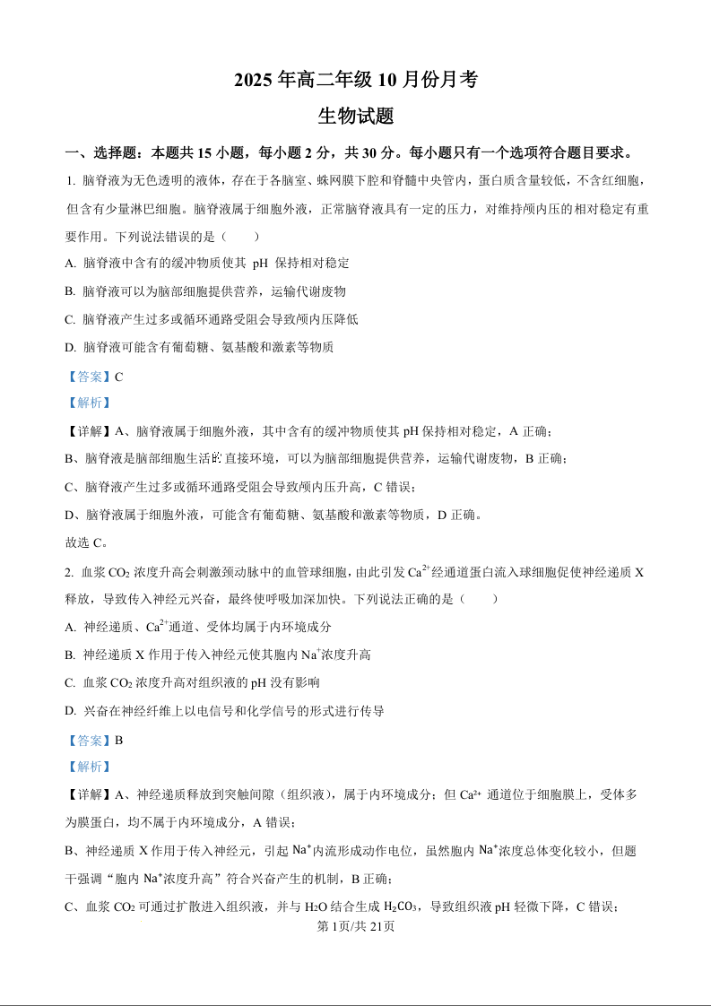 山东省济宁市第一中学2025-2026学年高二上学期10月月考 生物答案.docx