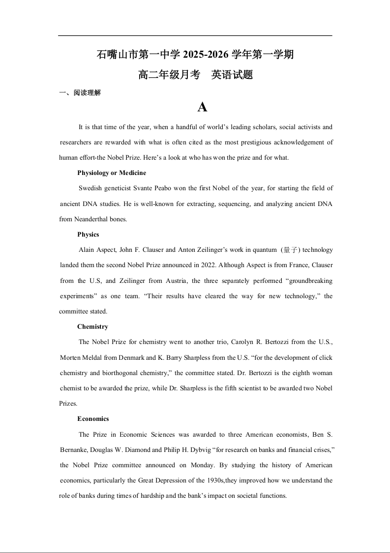 宁夏回族自治区石嘴山市第一中学2025-2026学年高二上学期10月月考 英语.docx