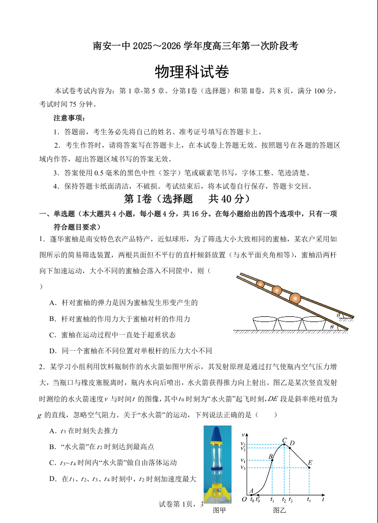 福建省泉州市南安第一中学2026届高三上学期第一次段考 物理试题(含答案).docx
