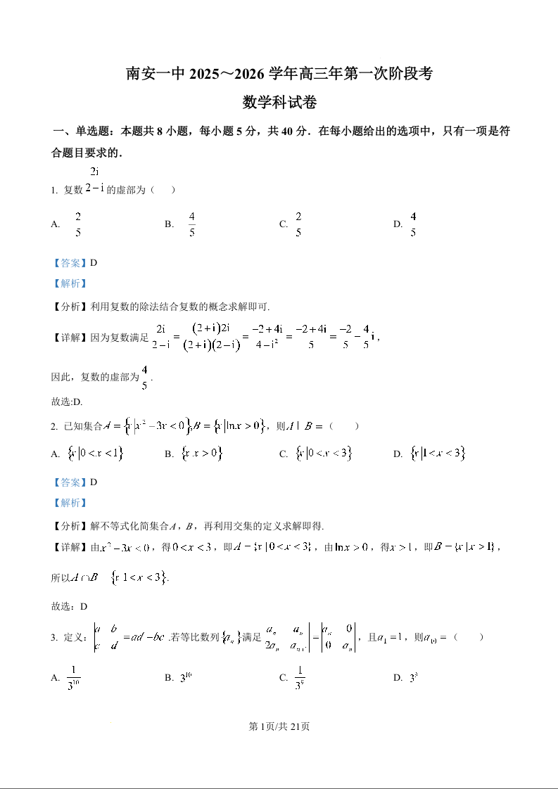福建省泉州市南安第一中学2026届高三上学期第一次段考 数学答案.docx