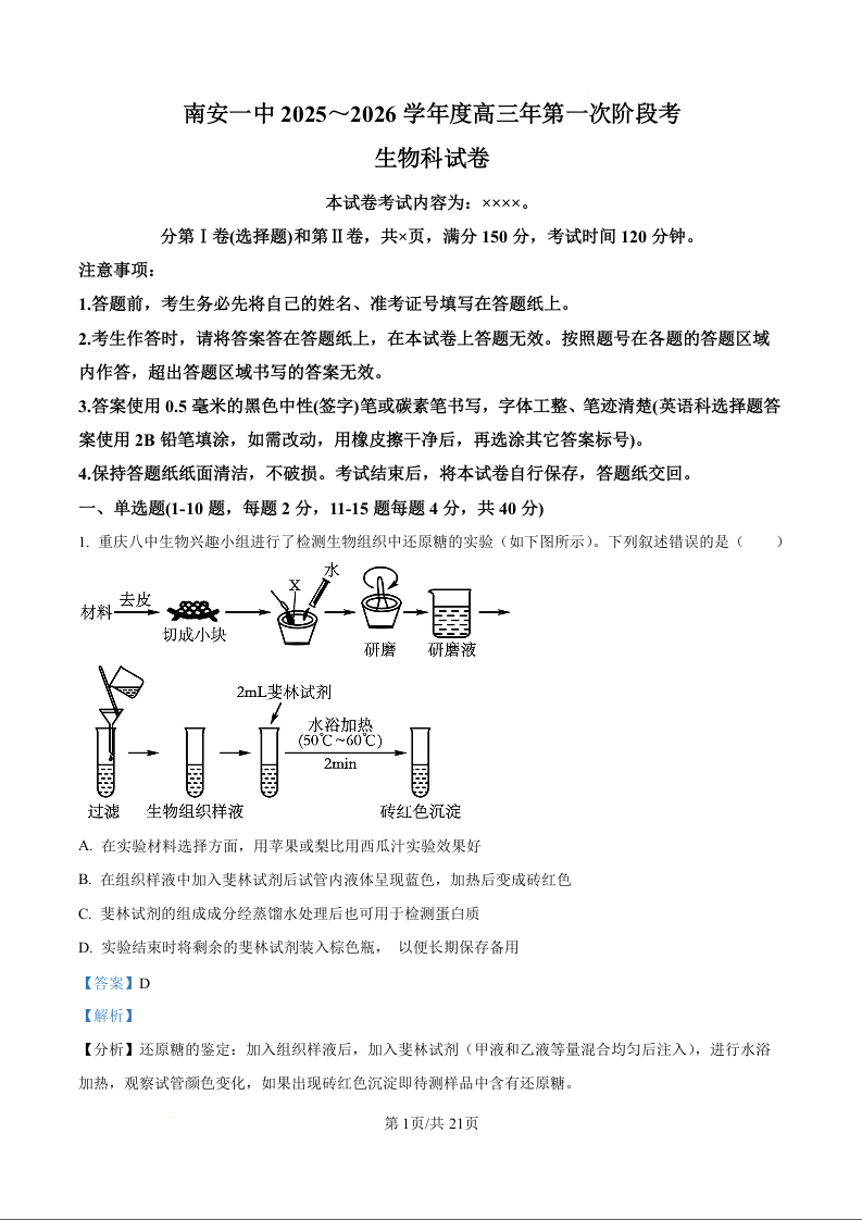 福建省泉州市南安第一中学2026届高三上学期第一次段考 生物答案.docx